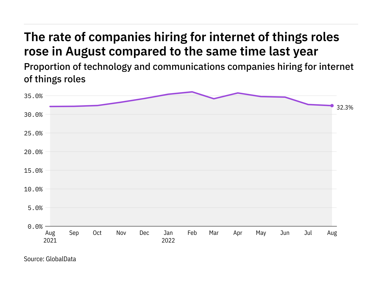 The proportion of technology and communications companies hiring for internet of things related positions kept relatively steady in August 2022 compared with the equivalent month last year, with 32.3% of the companies included in our analysis recruiting for at least one such position.