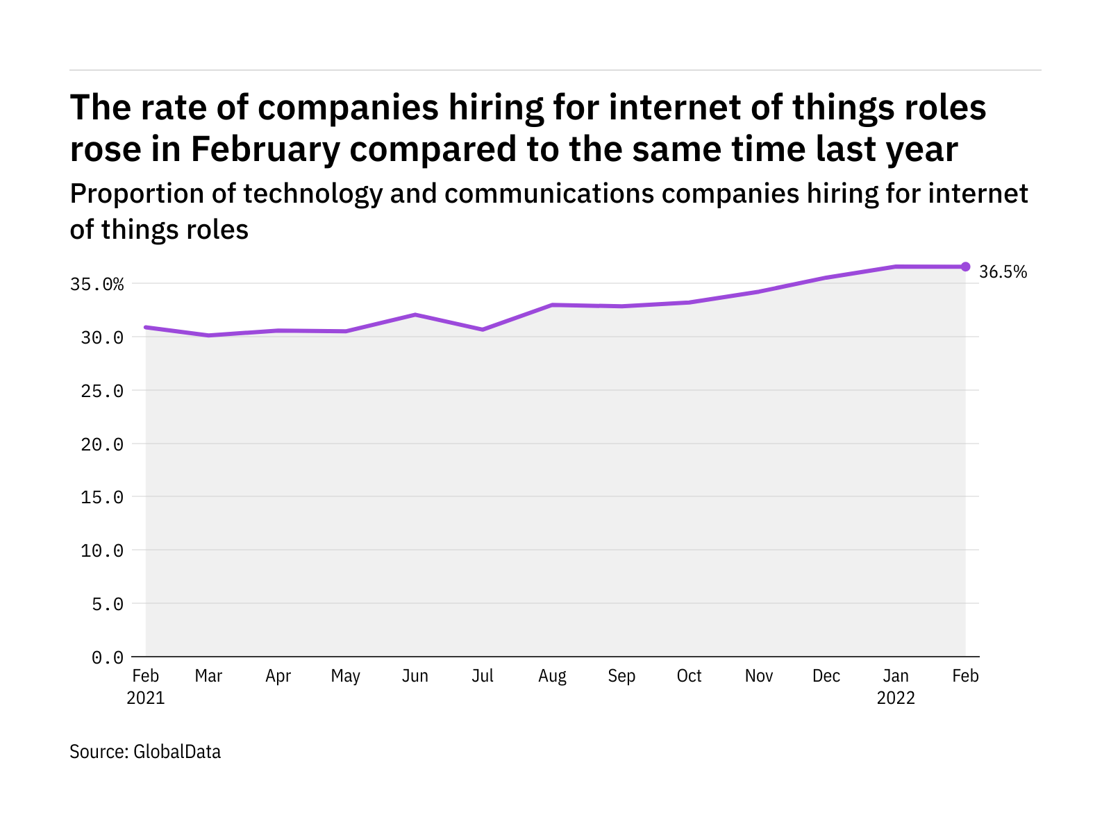 The proportion of technology and communications companies hiring for internet of things related positions rose in February 2022 compared with the equivalent month last year, with 36.5% of the companies included in our analysis recruiting for at least one such position.