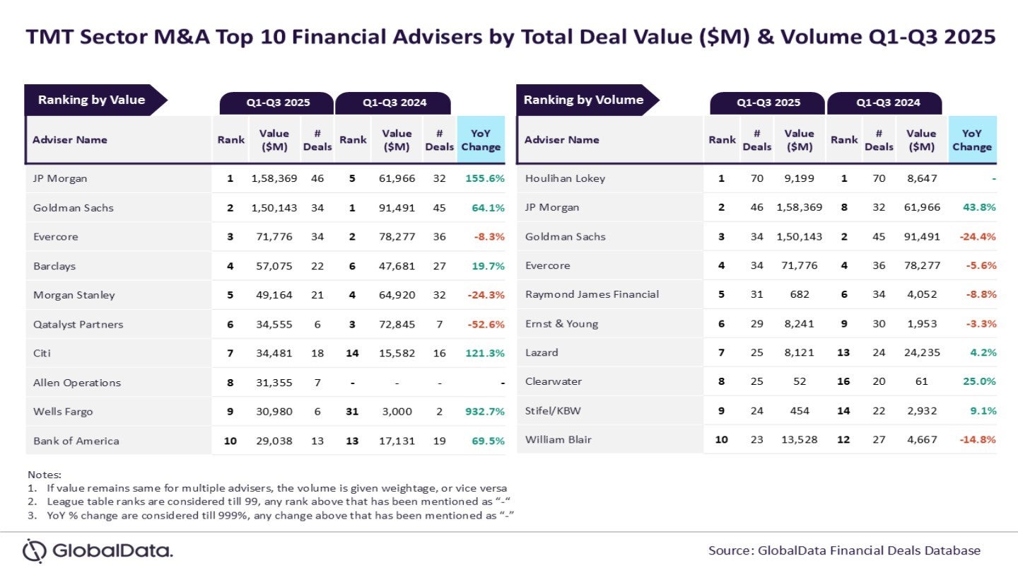 JP Morgan has ranked first by deal value and Houlihan Lokey by deal volume among financial advisers for mergers and acquisitions (M&A) in the technology, media and telecom (TMT) sector during the first three quarters of 2025, according to research from GlobalData.