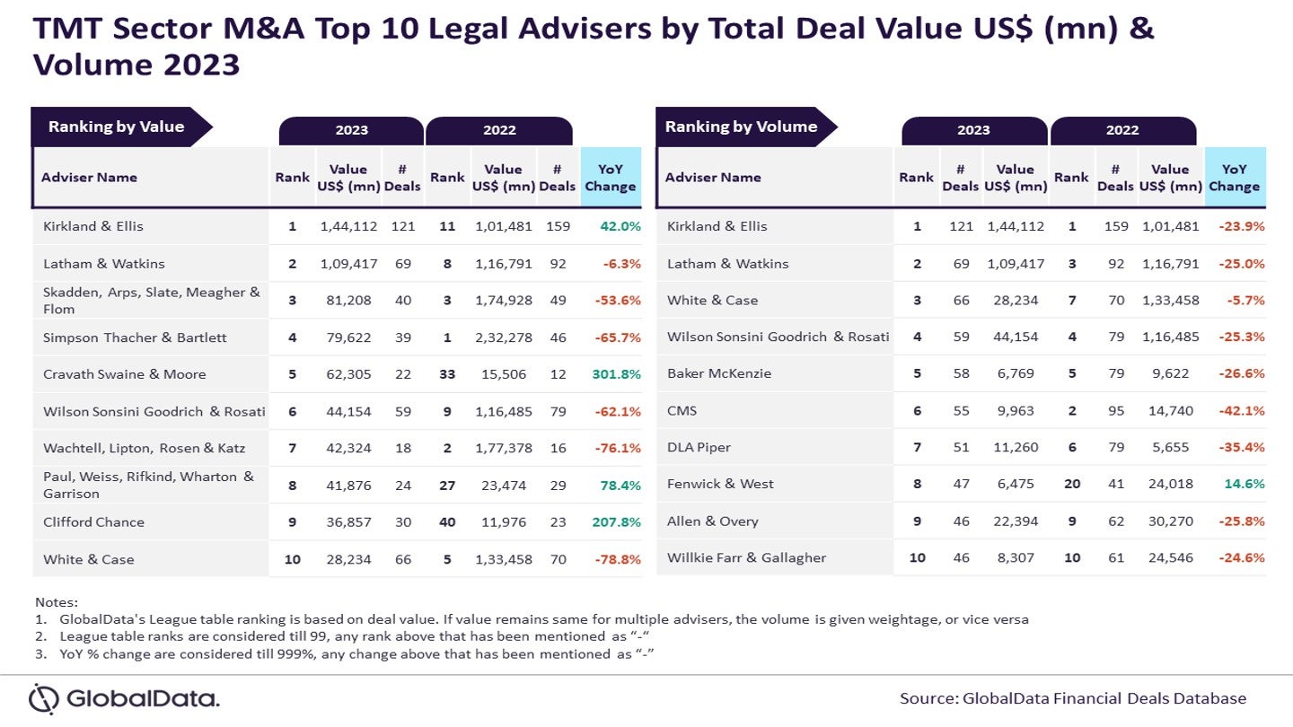 Kirkland & Ellis has emerged as the top mergers and acquisitions (M&A) legal adviser in the technology, media, and telecom (TMT) sector for 2023, both in terms of deal value and volume, as per GlobalData’s latest legal advisers league table.