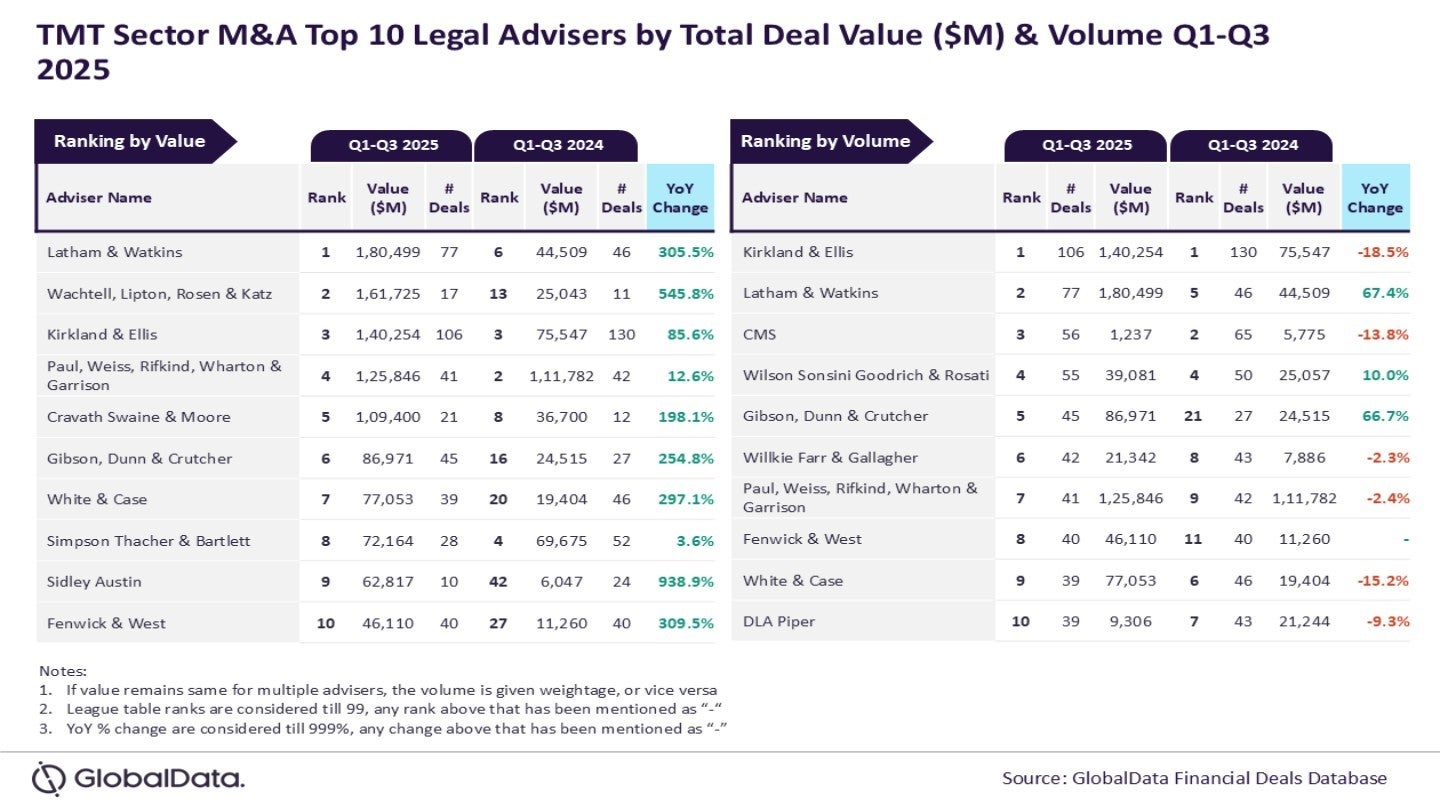 Latham & Watkins led mergers and acquisitions (M&A) legal advisory by deal value in the technology, media and telecom sector (TMT) during the first three quarters of 2025, handling transactions worth $180.5bn, according to GlobalData.