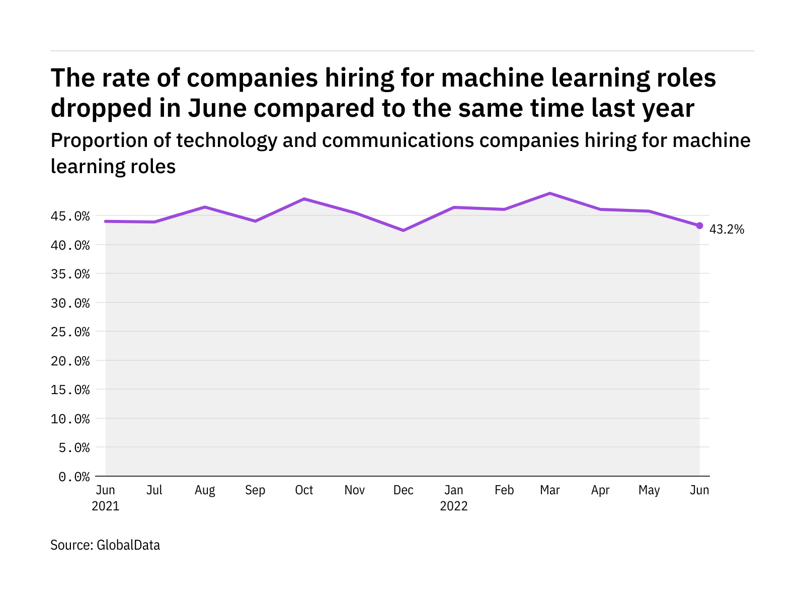 The proportion of technology and communications companies hiring for machine learning related positions kept relatively steady in June 2022 compared with the equivalent month last year, with 43.2% of the companies included in our analysis recruiting for at least one such position.
