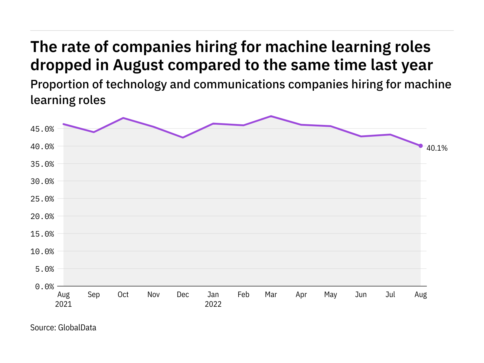 Our analysis of the data shows that technology and communications companies are currently hiring for machine learning jobs at a rate higher than the average for all companies within GlobalData's job analytics database. The average among all companies stood at 1% in August 2022.
