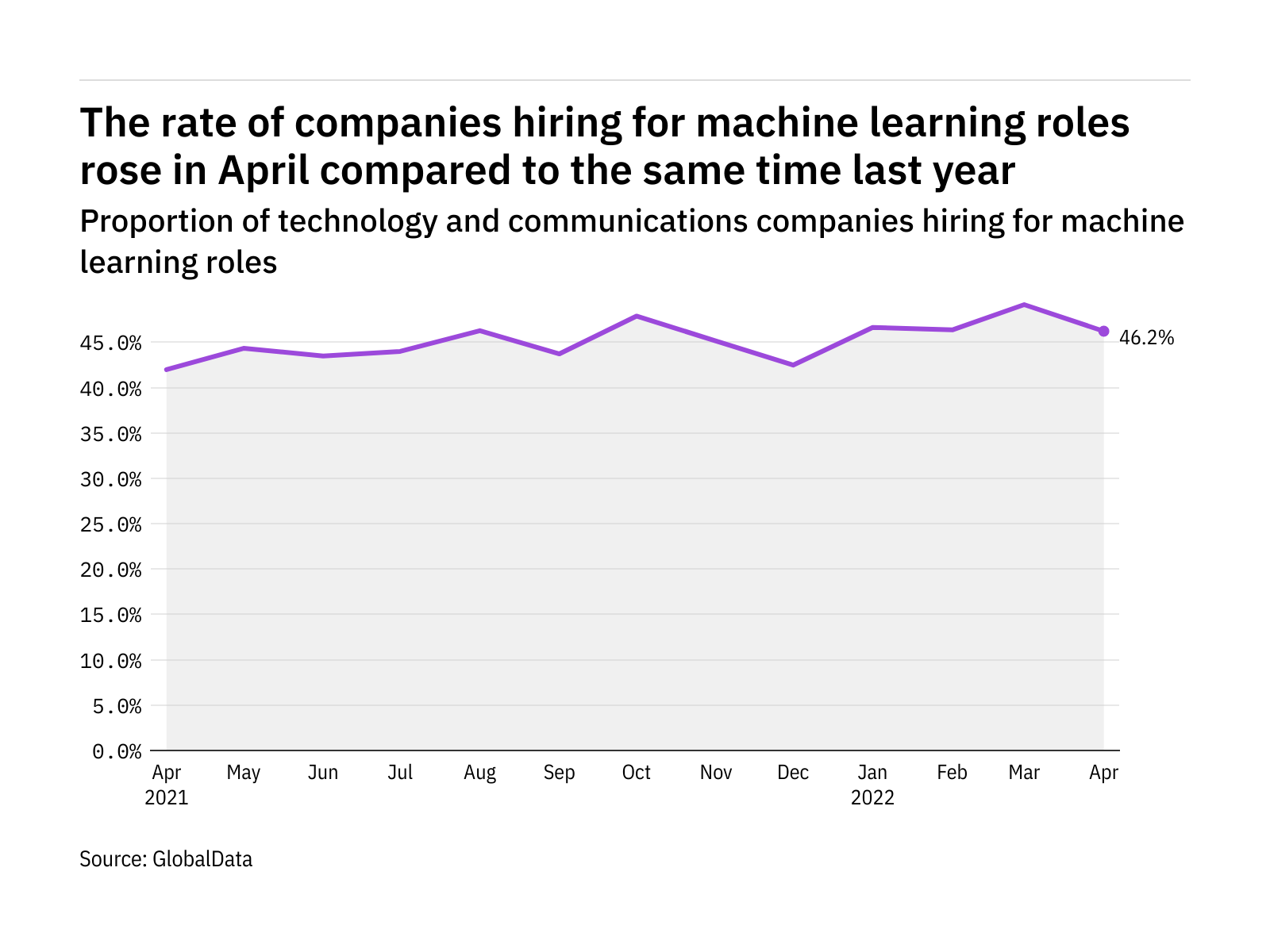 The proportion of technology and communications companies hiring for machine learning related positions rose in April 2022 compared with the equivalent month last year, with 46.2% of the companies included in our analysis recruiting for at least one such position.