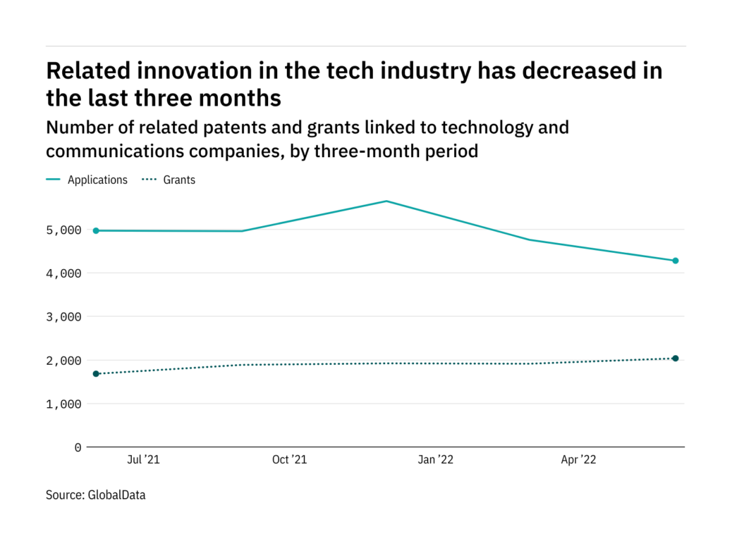 The most recent figures show that the number of related patent applications in the industry stood at 4,283 in the three months ending June – down from 4,972 over the same period in 2021.