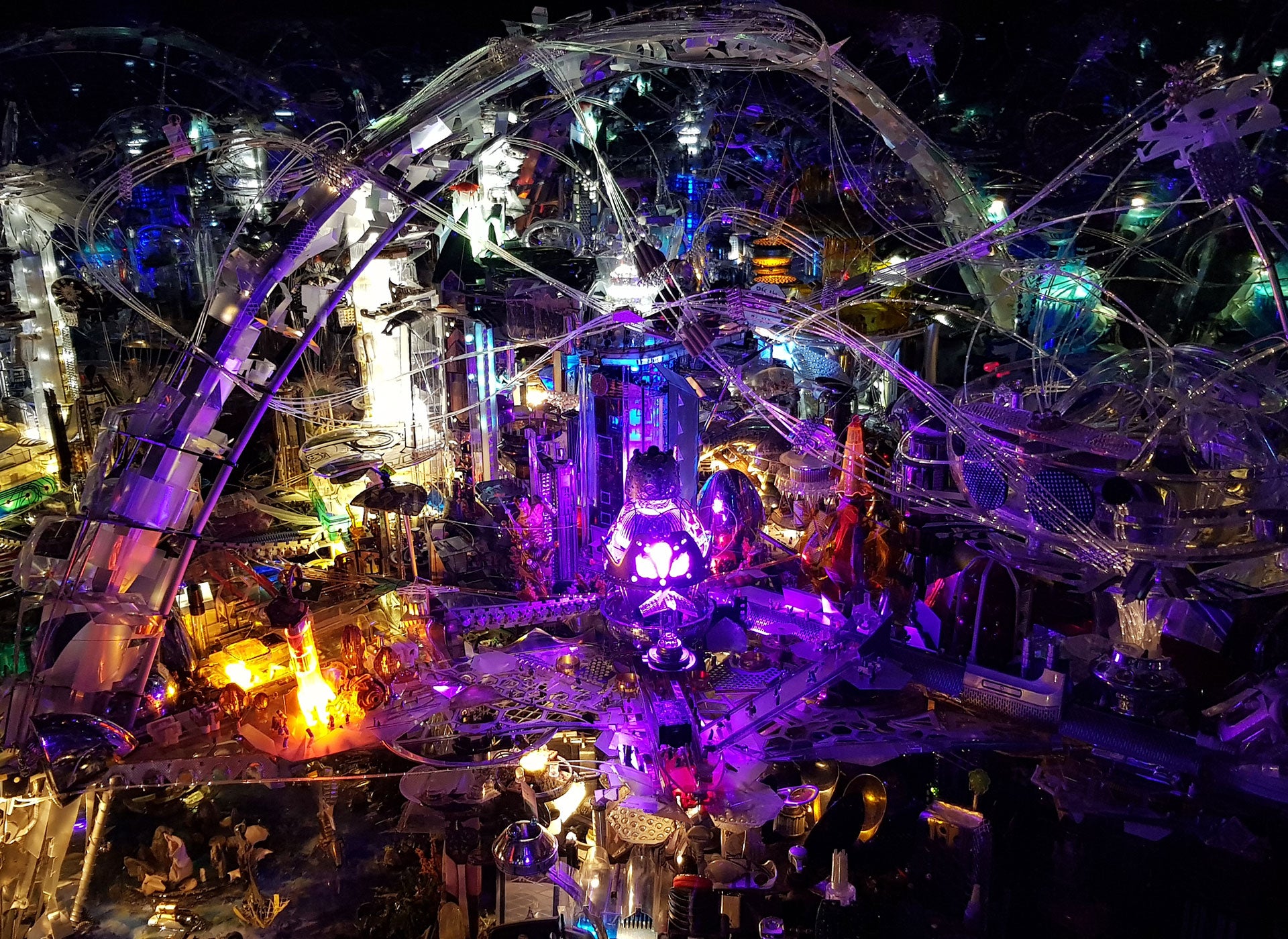 Krajewski’s own artworks combine recycled materials with sophisticated technology to produce futuristic interactive cityscapes that play out a story, reminiscent of Victorian penny arcade automata.