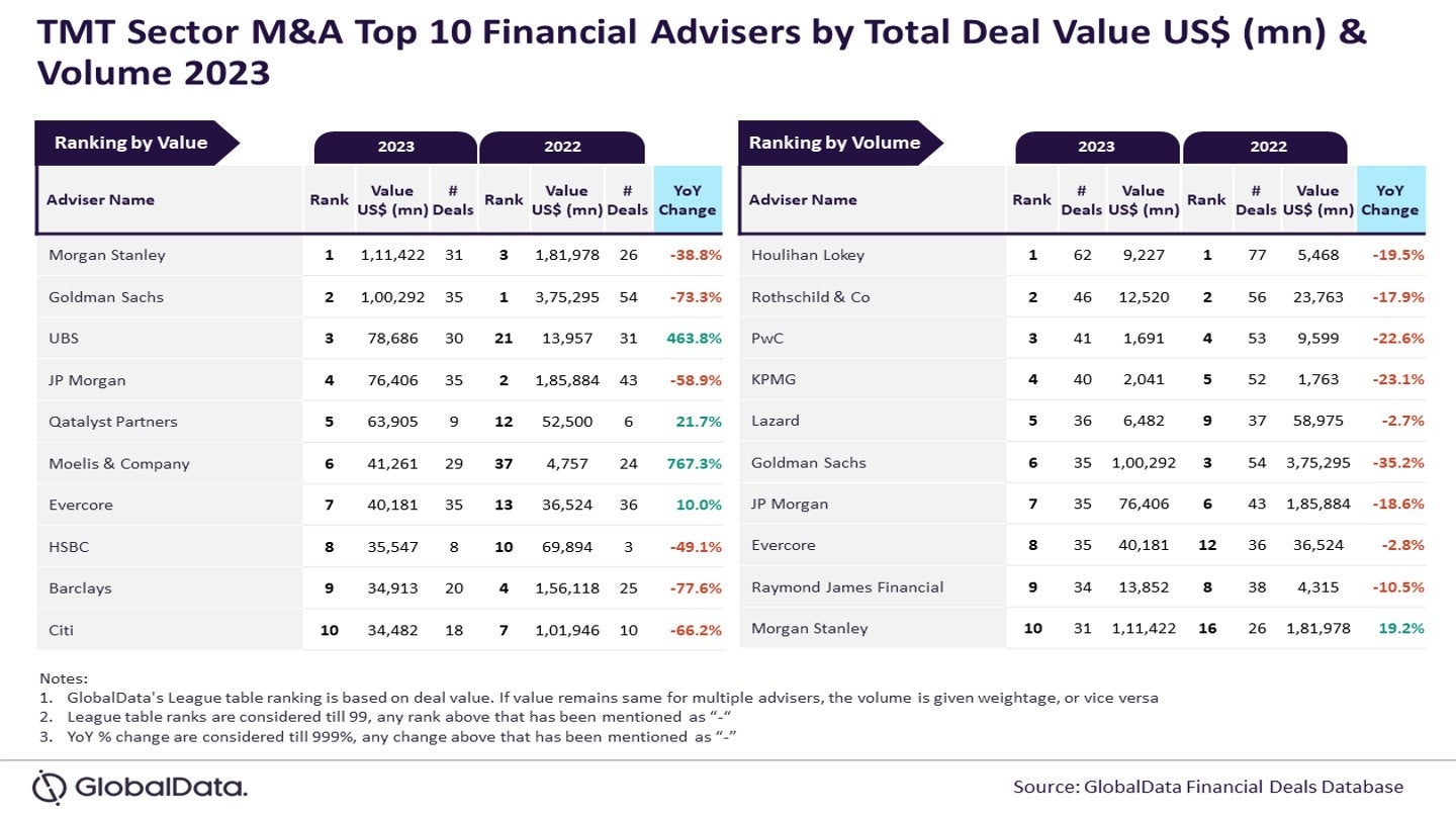 Morgan Stanley and Houlihan Lokey have emerged as the leading financial advisers for mergers and acquisitions (M&A) by value and volume, respectively, in the technology, media, and telecom (TMT) sector in 2023, as per GlobalData’s latest financial advisers league table.