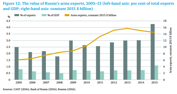 According to data by SIPRI, 21 percent of global arms sales in 2016 were Russian. As well, between 2000 and 2016, it was responsible for an annual average of 25 percent of global exports.