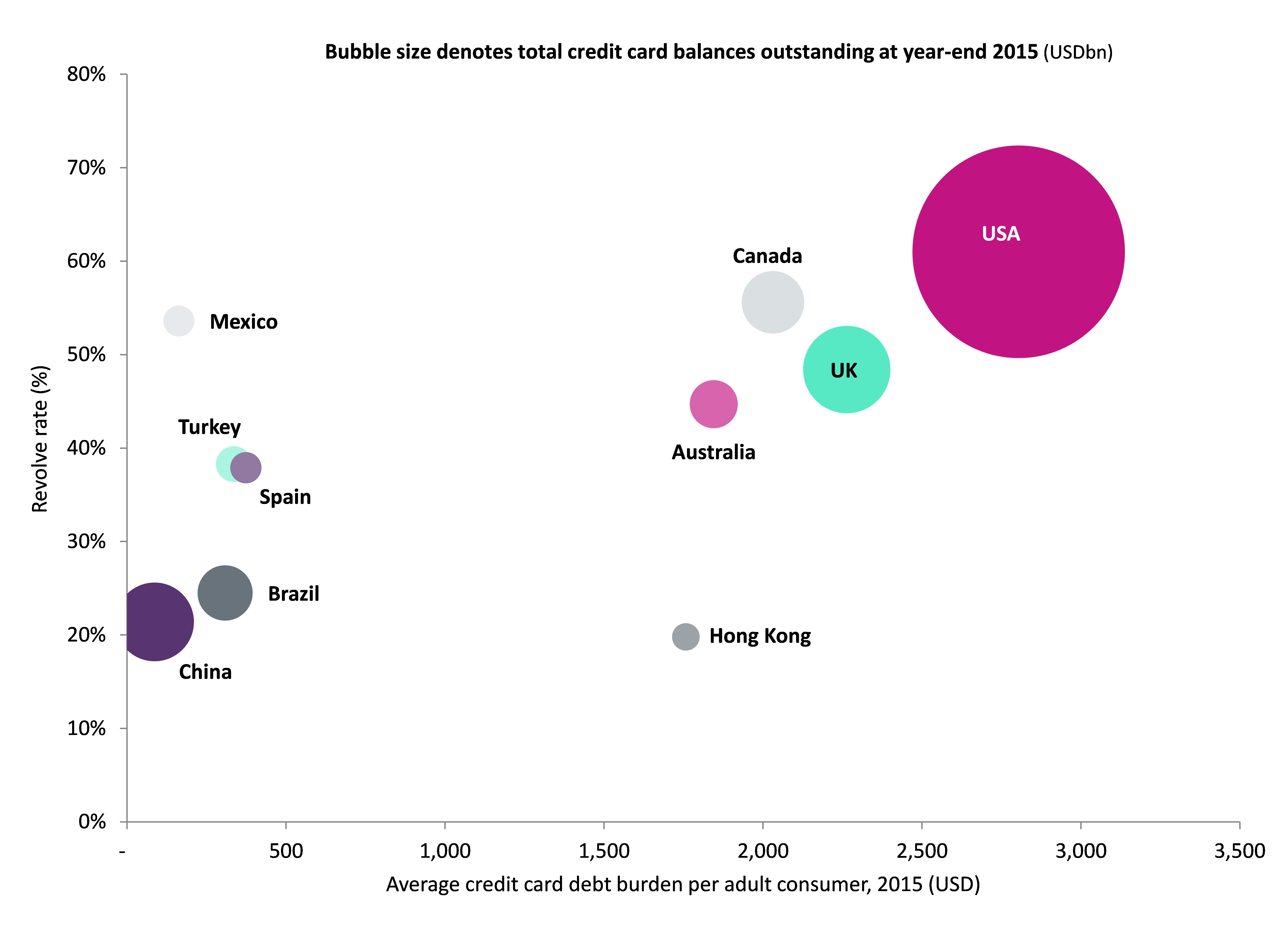 The US is also the most indebted market per capita, as well as having the highest percentage of consumers who revolve their credit card balances (revolve rate) among the top 10 markets.