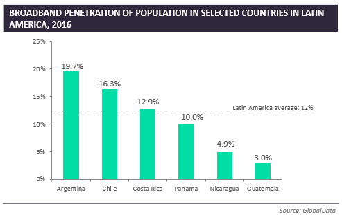 Despite Panama’s strong economic outlook and high PPP-adjusted GDP per capita, the country’s broadband penetration of population is below the Latin America average of 12 percent and also significantly below when compared to Argentina and Chile. Reaching 10 percent of broadband penetration of population in 2016, Panama is below its neighbouring Costa Rica, but above other Central America countries such as Nicaragua and Guatemala.