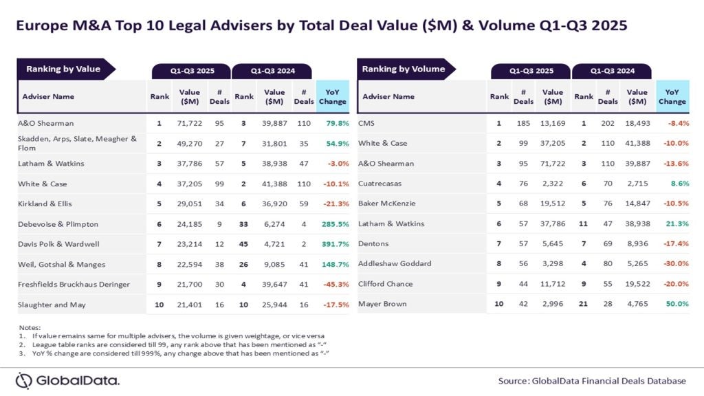 News A&O Shearman and CMS top Europe M&A legal advisory rankings for Q1-Q3 2025 Vidhya Edwards Munnangi