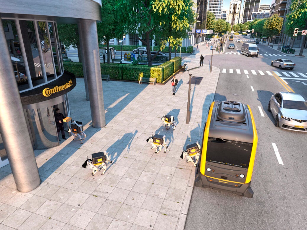 The robo-dogs, which bear some resemblance to Boston Dynamics’ door-opening robot, will hitch a ride on Continental’s driverless vehicle, known as the Continental Urban Mobility Experience (CUbE).