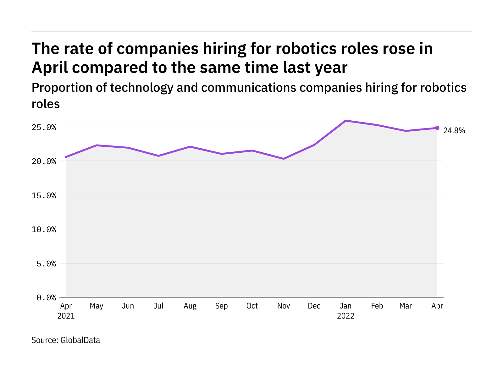 The proportion of technology and communications companies hiring for robotics related positions rose in April 2022 compared with the equivalent month last year, with 24.8% of the companies included in our analysis recruiting for at least one such position.