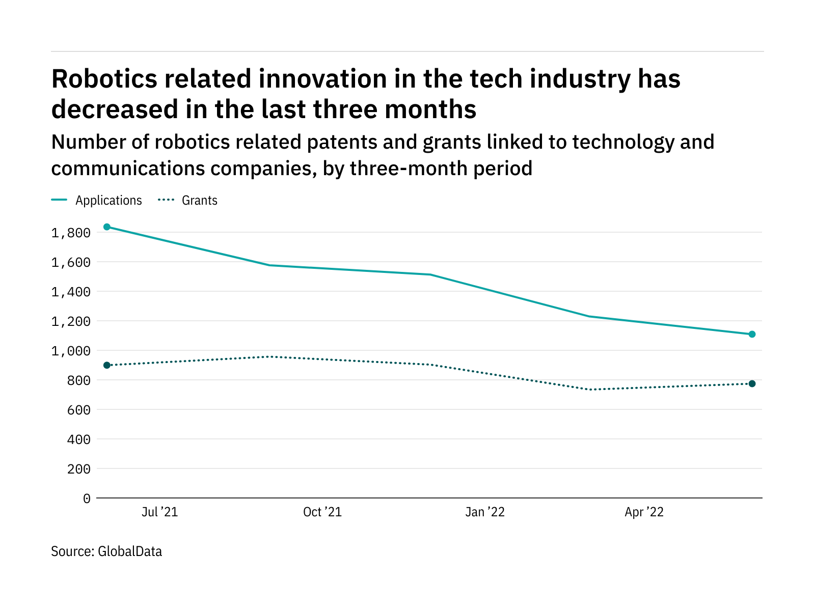 The most recent figures show that the number of robotics related patent applications in the industry stood at 1109 in the three months ending June – down from 1836 over the same period in 2021.