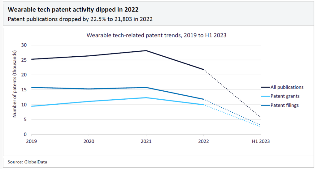 Patent filings for wearable tech dropped by nearly 25% in 2022 compared to the previous year, as the number of filings from top patent offices in the US, China, Europe, South Korea and Japan declined due to uncertain economic conditions.