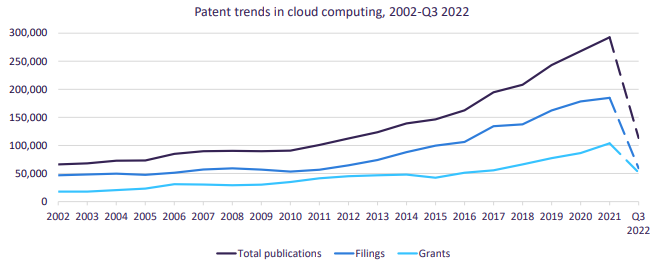 By GlobalDataPatent activity within cloud computing also rose dramatically between the years 2002 and 2021, according to GlobalData’s patent analytics. Within these years, cloud patent activity increased by 350% as the total number of publications rose from 66,000 in 2002 to 300,000 in 2021.