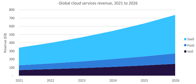 SaaS (software as a service) is expected to comprise the biggest part of the global revenue of cloud computing, expanding at a CAGR of 17%, the research analyst said.