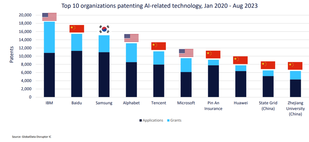 Microsoft was the third most active US company in both patent applications and publications between January 2020 and August 2023.