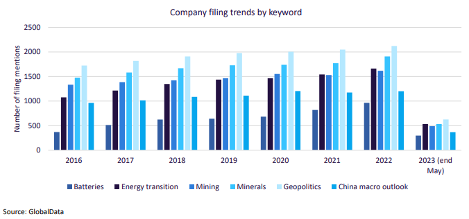 Since 2018, mentions of geopolitics, critical minerals and the transition to green energy have been steadily increasing according to research analyst company GlobalData’s company filings database.