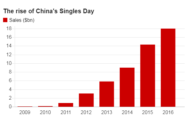 Since launching in 2009, Singles Day, aptly named to imply anti-Valentine’s Day sentiment, has generated more and more revenue every year.