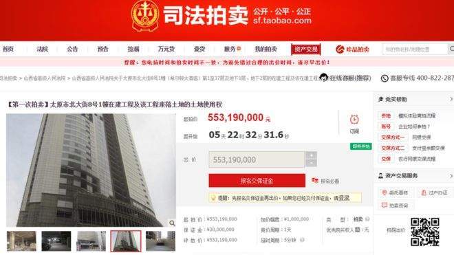 In November, a 28-floor building was put up for auction at a starting price of 219m yuan ($33.4m) by a local court in northeastern Zhejiang province on the Taobao platform.