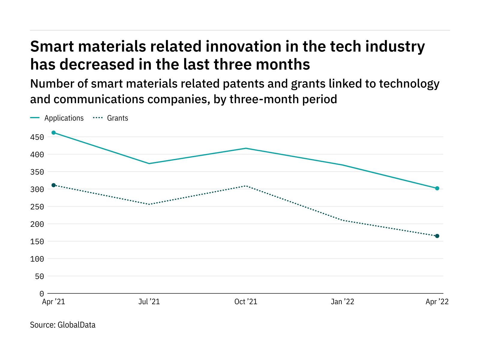 The most recent figures show that the number of smart materials related patent applications in the industry stood at 302 in the three months ending April – down from 462 over the same period in 2021.