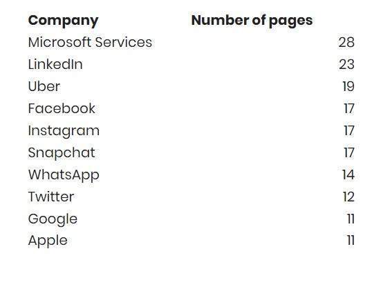Microsoft’s Services Agreement came out top with 28 pages in total.