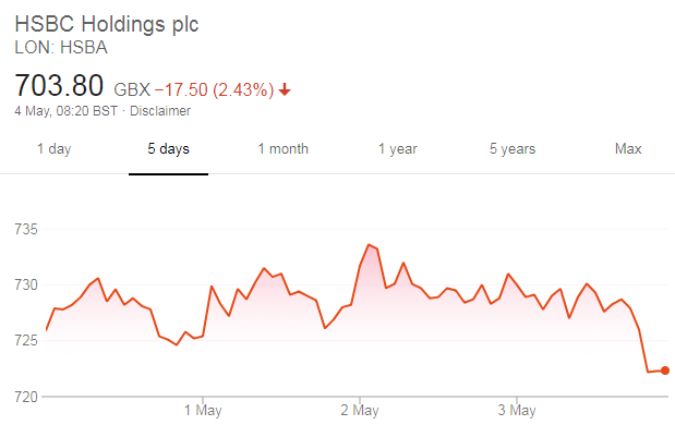 The HSBC share price has dipped after the London-based global banking giant posted a surprise fall in pre-tax profits for the first three months of the year, which the bank’s blamed on higher costs.