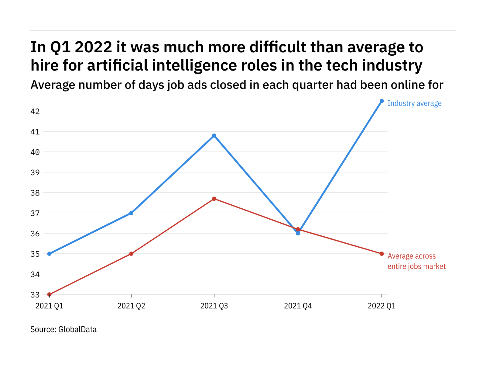Artificial intelligence related jobs that were closed during Q1 2022 had been online for an average of 42.5 days when they were taken offline.