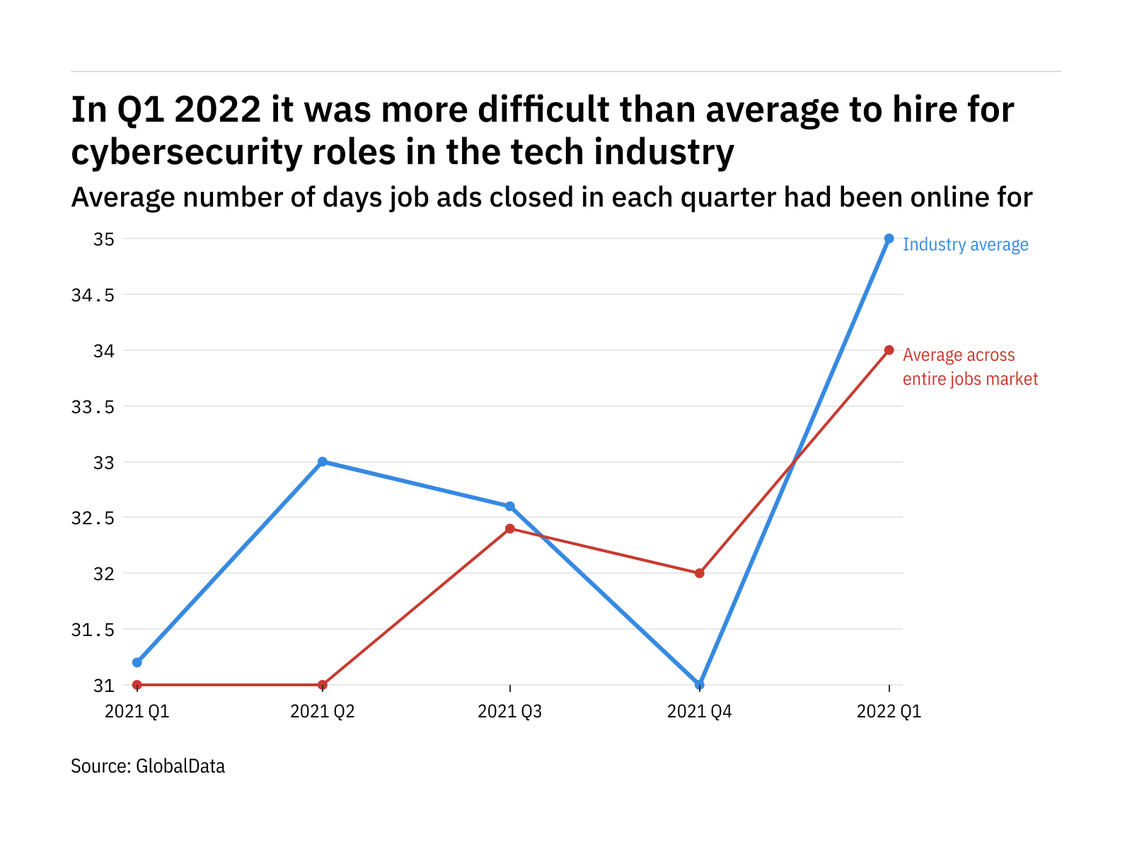 Cybersecurity related jobs that were closed during Q1 2022 had been online for an average of 35 days when they were taken offline, according to new data.