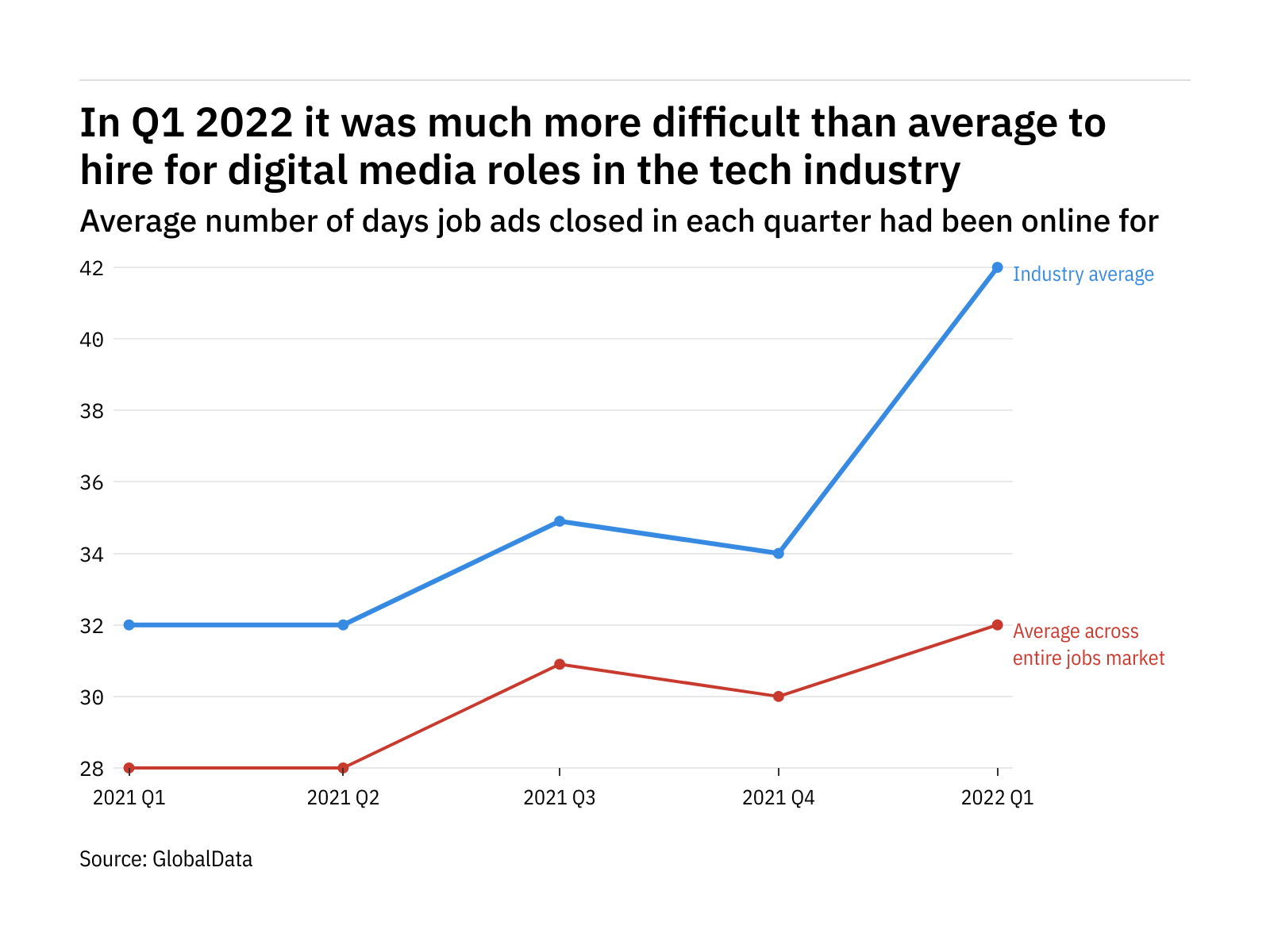 While the tech industry found it harder to fill these roles in the latest quarter, these companies also found it harder to recruit digital media jobs than the wider market, with ads online for 31.2% more time on average compared to similar jobs across the entire jobs market.
