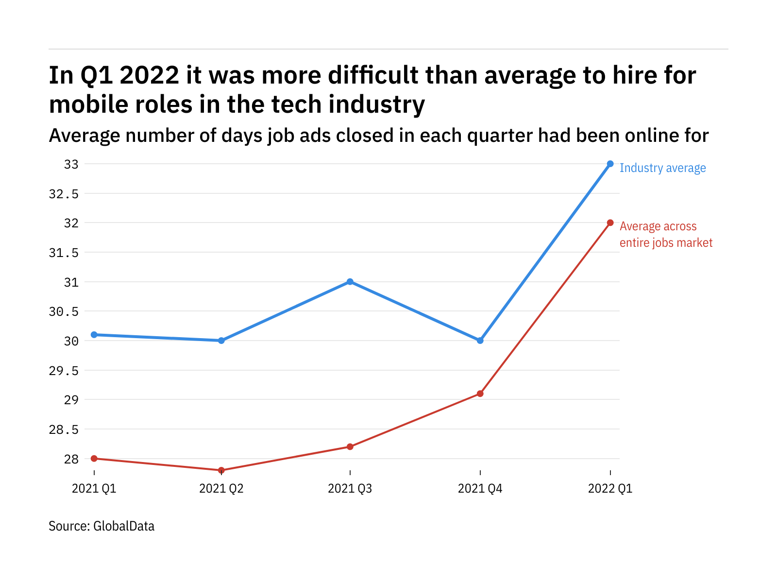 Mobile related jobs that were closed during Q1 2022 had been online for an average of 33 days when they were taken offline.