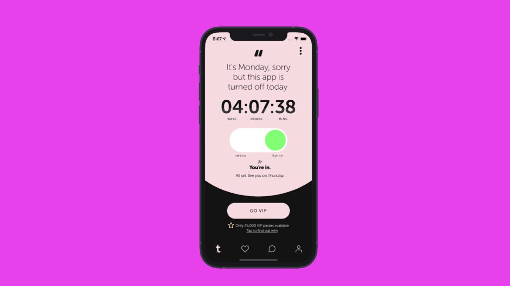The Thursday dating app is only available on Thursdays. Users can only search for, match and chat with would-be paramours for 24 hours on the fourth day of the week. Then, just like for Cinderella, the magic disappears at the stroke of midnight, with no chats or matches to be saved. The founders believe this encourages serious singles to set up dates directly and cut through plenty of time-wasting waffle.