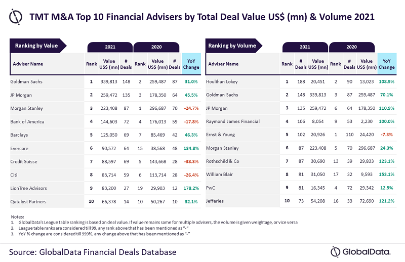 GlobalData, a leading data and analytics company, has revealed its global league tables for top 10 financial advisers in technology, media & telecom (TMT) sector by value and volume for 2021 in its report, ‘Global and Technology, Media & Telecom M&A Report Financial Adviser League Tables 2021’.