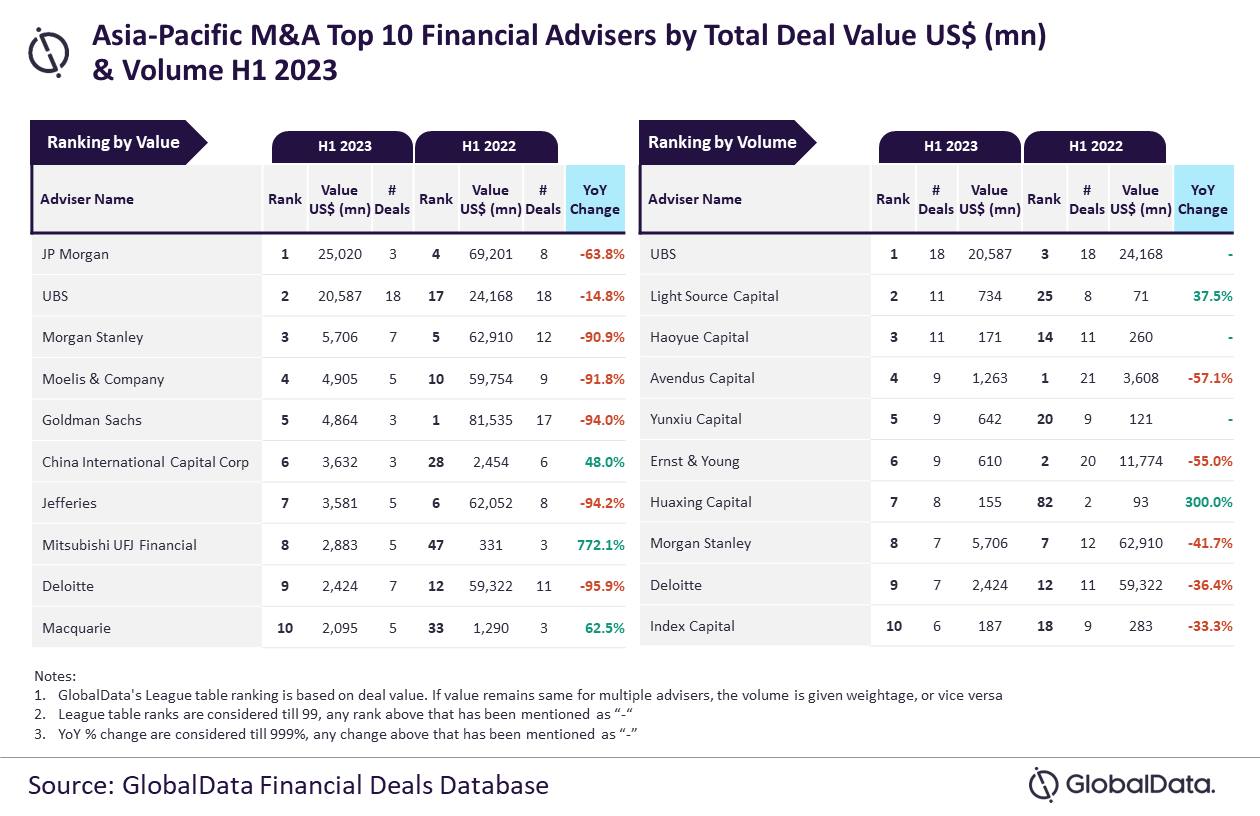 JP Morgan and UBS were the top mergers and acquisitions (M&A) financial advisers in the Asia-Pacific (APAC) region in H1 2023, according to GlobalData’s latest league table.