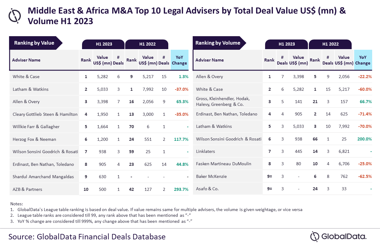 White & Case and Allen & Overy were the top mergers and acquisitions (M&A) legal advisers in the Middle East & Africa region in H1 2023, according to GlobalData’s latest league table.