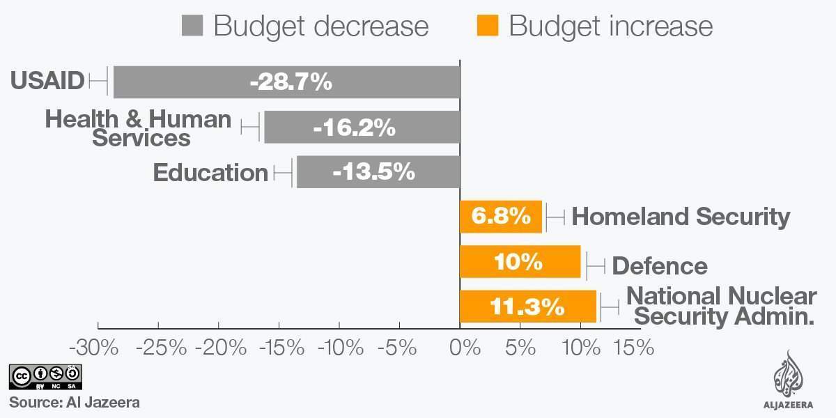 When it comes to the military, Trump declared his hopes to increase spending by $54bn — a 10 percent jump from the current amount.