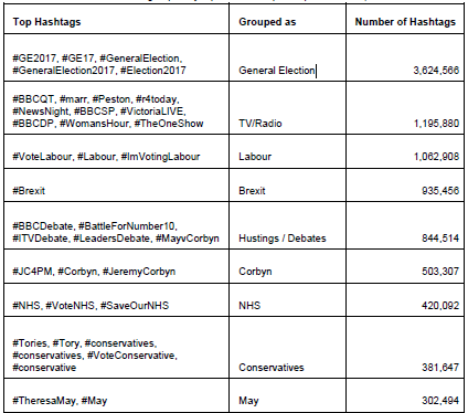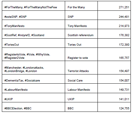 The only other political issues to feature in the top twenty hashtags were the co-called “dementia tax” and a potential second Scottish referendum on independence.
