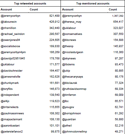 Corbyn’s handle also appeared in over a million mentions, compared to May’s handle, mentioned just over 650,000 times.