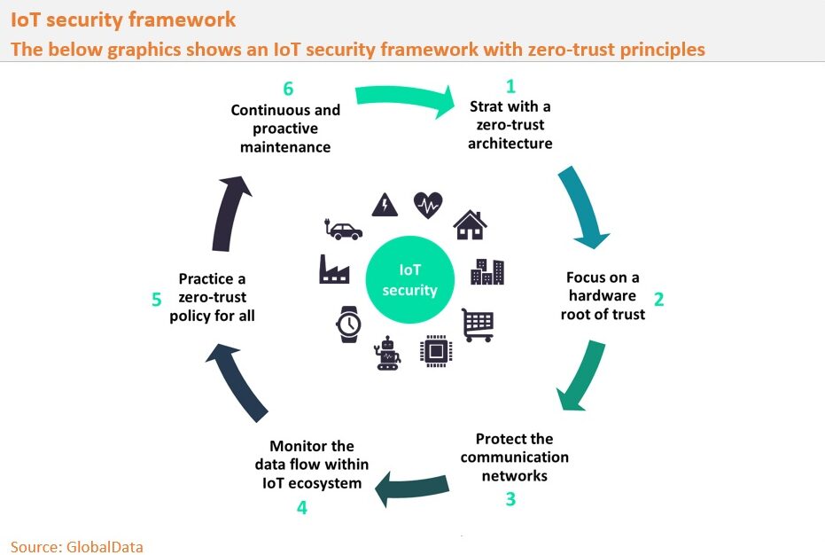 IoT at-risk devices include anything with an internet connection, from a refrigerator to smart locks, thermostats, lightbulbs, and vehicles. A significant threat is the prospect of attacks on sensors and devices used within the Industrial Internet or in smart cities domains. That is why organizations need to focus on a zero-trust principle, which should govern the IoT ecosystem’s design, development, and deployment. GlobalData suggests a six-step cyclic IoT security framework to combat IoT security issues, as shown in the below graphic.