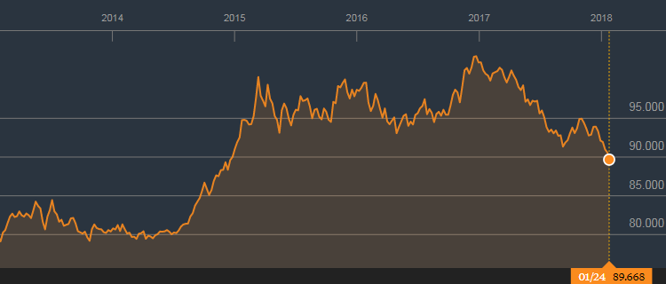 The ICE dollar index, which measures the dollar against a basket of six other currencies, fell nearly 10 percent in 2017. That’s the biggest annual decline since 2003 when the US dollar fell almost 15 percent.