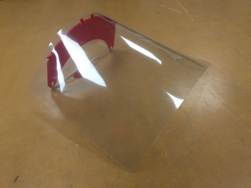 “The visor is made out of three components. The laser cut headband that uses 3mm acrylic sheet, 2 x 125mm elastic bands, and a PET visor made out of a gloss laminator pouch that has been passed through the laminator machine with no article inside,” he says.