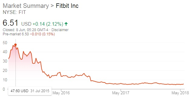 To get an idea of the consumer wearables market’s decline, just take a look at the Fitbit stock price.